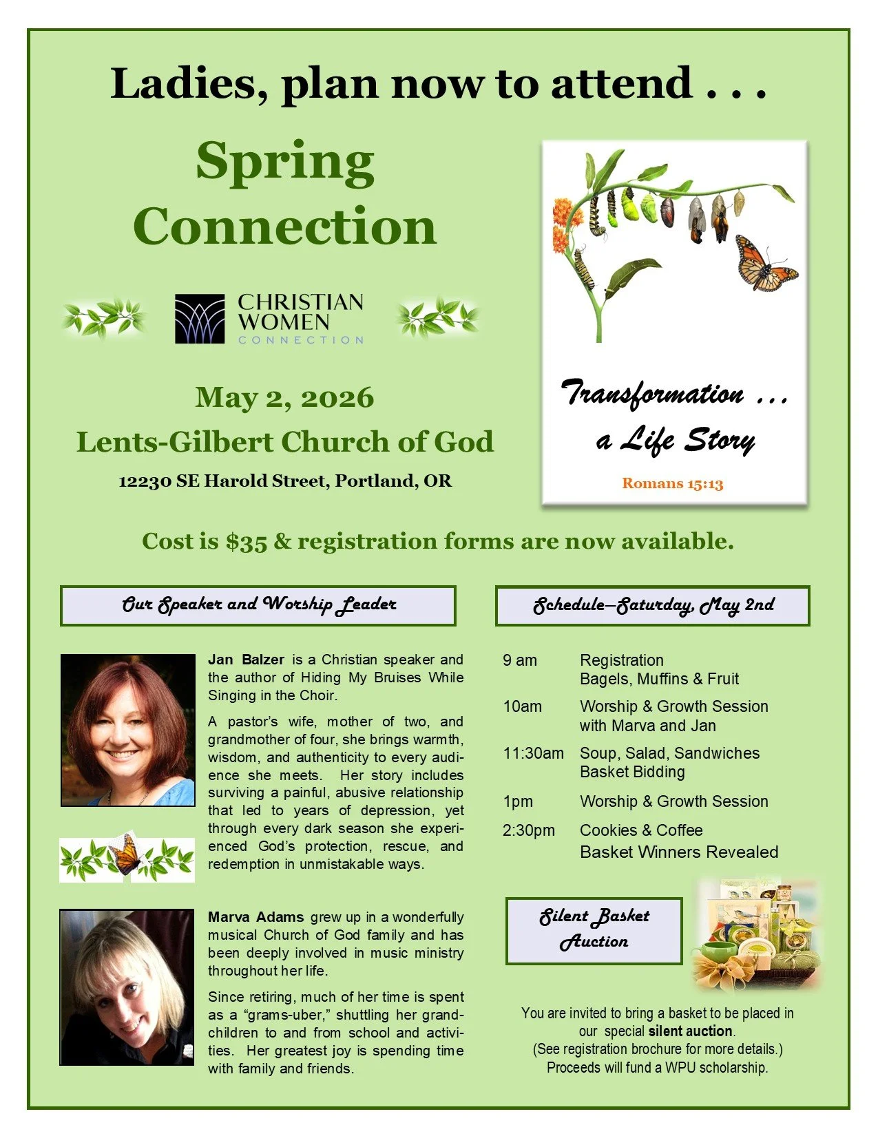 Brian Arnold, Lead Pastor of Lynchwood Church of God in Portland, is this year’s speaker and will share on the theme of Nothing Wasted: How Broken Stories Come to Life. He will focus on the faith journey of Joseph in the Old Testament and how God worked in Joseph’s life, shaping and forming him into a person God used in mighty ways. God is working in us and shaping us for His purposes as well. As Paul wrote to the church in Rome: “And we know that in all things God works for the good of those who love him, who have been called according to his purpose” (Romans 8:28 NIV).